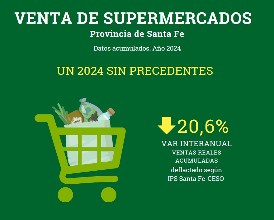 Las ventas en los supermercados santafesinos tuvieron un año “sin precedentes”: a lo largo del 2024 registraron un desplome interanual del 20,6%, según un informe realizado por el Centro de Estudios Económicos y Sociales Scalabrini Ortiz (Ceso). Las mayores mermas de consumo se reportaron en artículos electrónicos, bebidas e indumentaria y calzado.