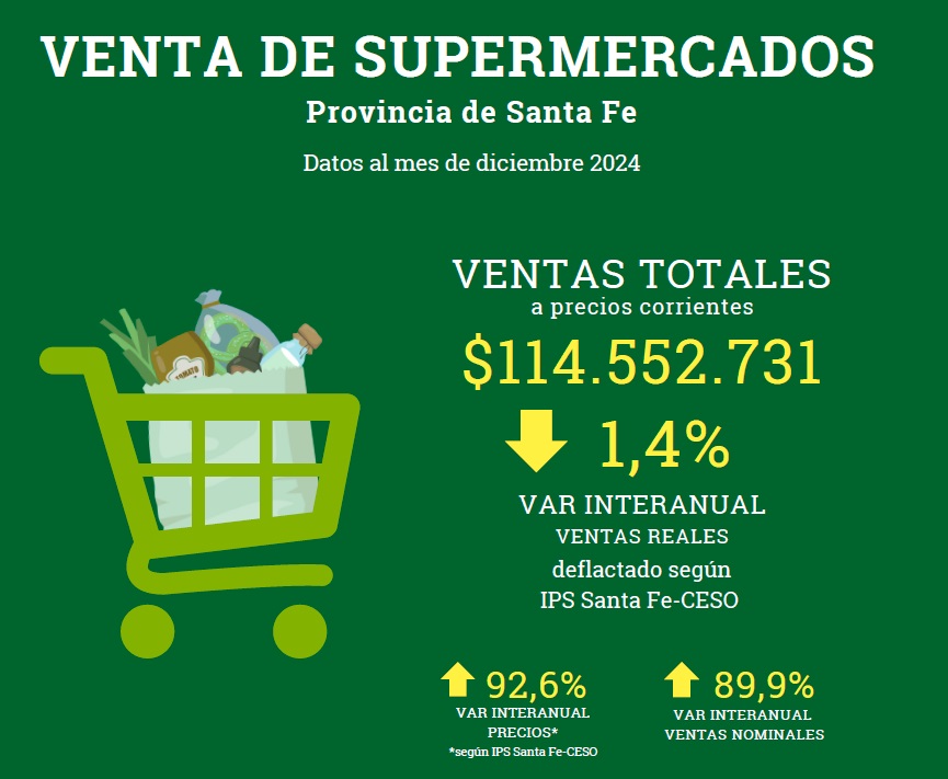 En diciembre pasado, los supermercados de la provincia de Santa Fe registraron ventas, a precios corrientes, por $114.552.731, mostrando así una caída interanual del 1,4%. Mientras tanto, los precios en estos comercios tuvieron un incremento del 92,6% con respecto al último mes del 2023.