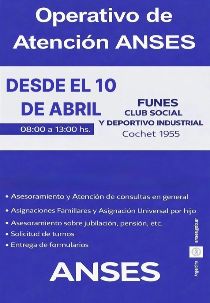 Tras tres años de ausencia, la ANSES vuelve a brindar atención presencial en Funes este viernes 10 de abril, de 8 a 13 h, en el Club Industrial (Cochet 1955). Bajo una modalidad itinerante, un funcionario asesorará sobre jubilaciones, pensiones, AUH y asignaciones familiares, además de entregar formularios y gestionar turnos. Aunque es una respuesta clave a la gran demanda local, por ahora sólo se confirmó la atención para esta jornada específica y desde el club aseguraron que se debe sacar turno previamente al teléfono 3415 41-9533